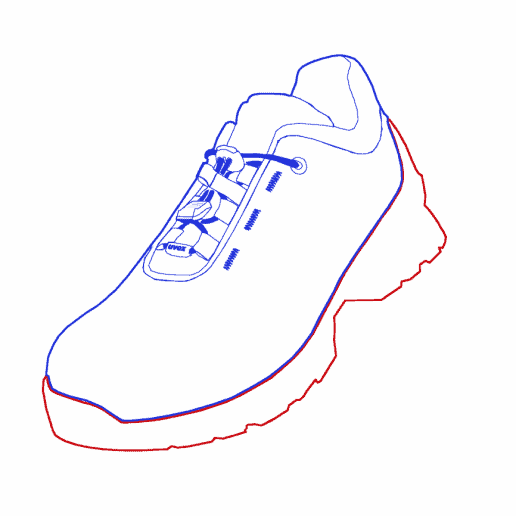 The shoe cross-section shows the lacing system. Shoelaces are an extremely effective way of customising the fit of footwear and adjusting the volume to put on and take off the footwear. On some styles we also use elastic shoelaces to allow a quick and easy fastening. The elastic laces also offer flexibility over the course of the day as they expand if the feet swell.