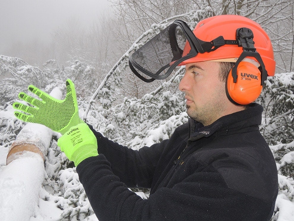 SeS: Ich trage als Helm den uvex pheos forest, welcher bereits ein integriertes Gittervisier hat. Außerdem verwende ich am liebsten die uvex C500 dry Handschuhe. Mit ihnen hab ich sowohl an der Motorsäge als auch an der Kreissäge genug Schutz und vor allem hervorragenden Halt. Andere uvex Produkte nehm ich bei Bedarf.