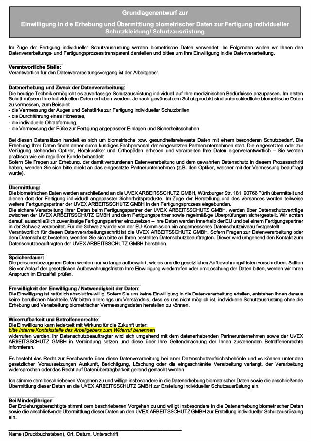 Im Zuge der Fertigung individuell angepasster Produkte zum Schutz Ihrer Mitarbeiter werden biometrische personenbezogene Daten verarbeitet. Diese biometrischen Daten stellen die Grundlage unseres Fertigungsprozesses dar und unterliegen einem besonders hohen Schutzbedarf. Eine Verarbeitung dieser Daten kann in der vorliegenden Konstellation im Regelfall nur auf der Erfüllung der arbeitsrechtlichen Pflichten Ihrerseits oder auf einer Einwilligung beruhen.