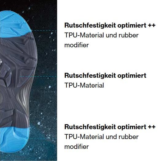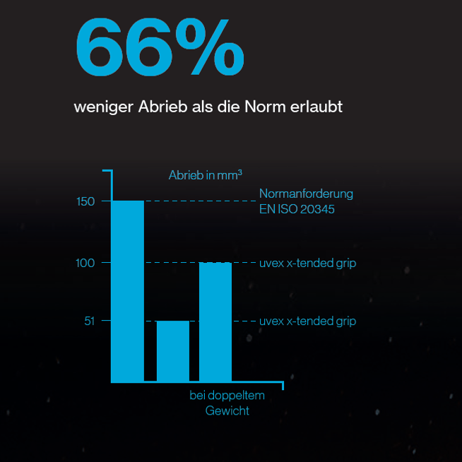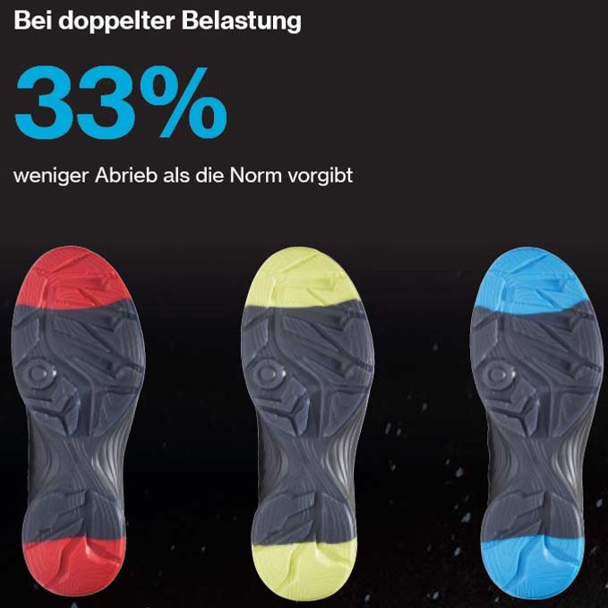 Die uvex x-tended grip Technologie garantiert auf Basis einer TPU-Laufsohle der neuesten Generation noch mehr Performance bei Abriebfestigkeit des Laufsohlenprofils sowie Rutschhemmung auf glatten oder nassen Böden. Das Ergebnis: Mehr Stabilität und Sicherheit für den Anwender beim Gehen. Weniger Verschleiß und damit geringere Kosten durch eine längere Nutzungsdauer.