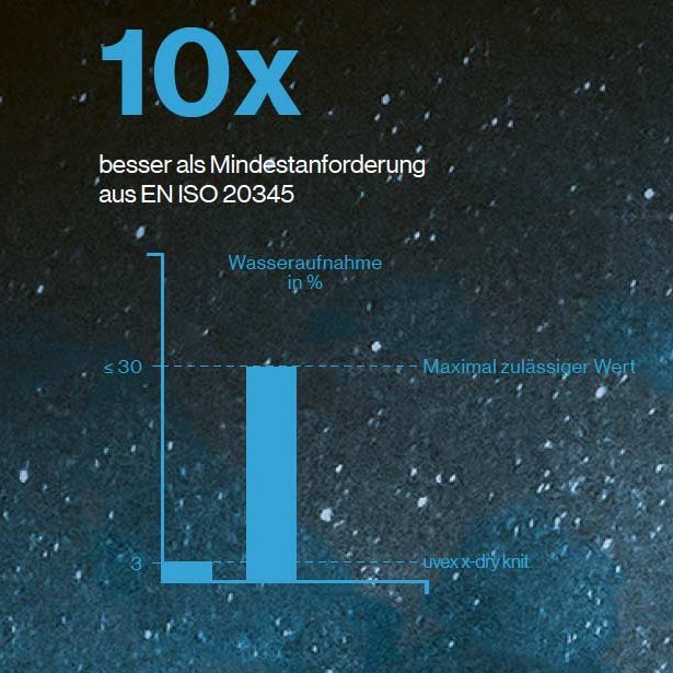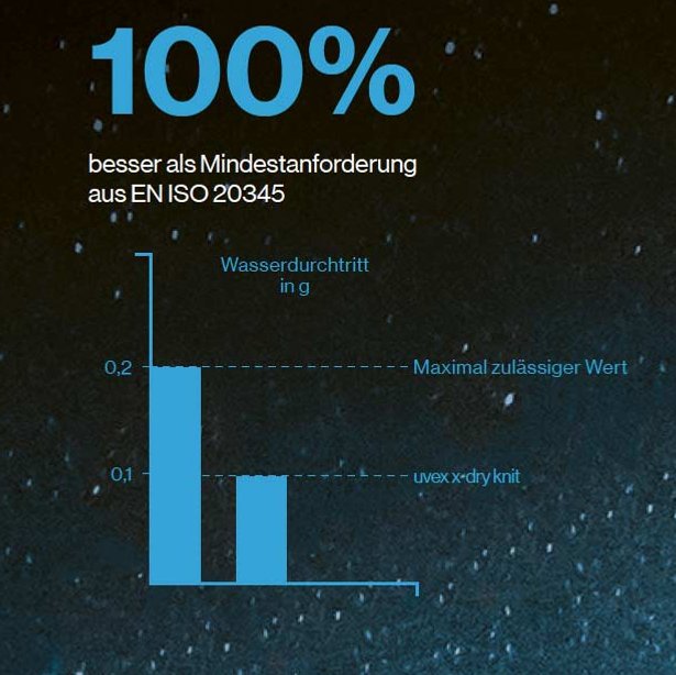 Die einzigartige uvex x-dry knit Technologie sorgt für noch nie da gewesenen Tragekomfort und trockene Füße: 365 Tage im Jahr, 7 Tage die Woche, 24 Stunden am Tag. Ermöglicht wird dies durch die intelligente Kombination von herausragender Atmungsaktivität mit wasserabweisenden Eigenschaften des innovativen uvex x-dry knit-Strickschafts. Schwitzen durch Überhitzung der Füße oder nasse Füße durch zu schnellen Wassereintritt von außen gehören der Vergangenheit an. Unabhängige Tests beim PFI Pirmasens beweisen die einzigartige Performance der uvex x-dry knit Technologie.