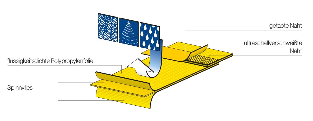 Das sehr leichte und flexible Spinnvlies-Folien-Laminat ist ideal für Reinigungsarbeiten und den Umgang mit Chemikalien in geringer Konzentration. Die verschweißten und überklebten Nähte schützen zusätzlich ohne Beeinträchtigung des Komforts.