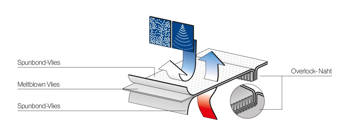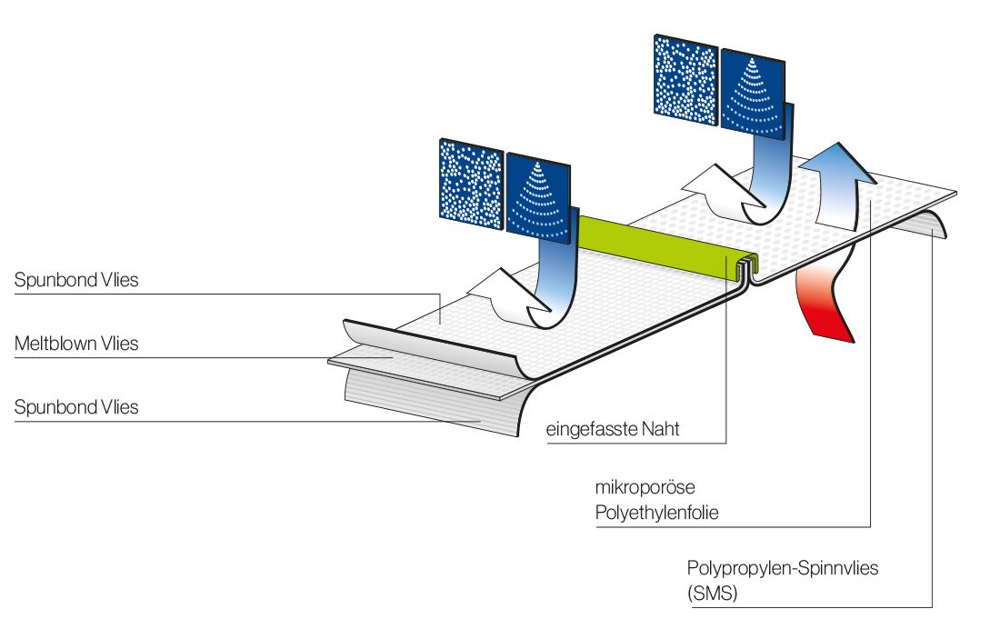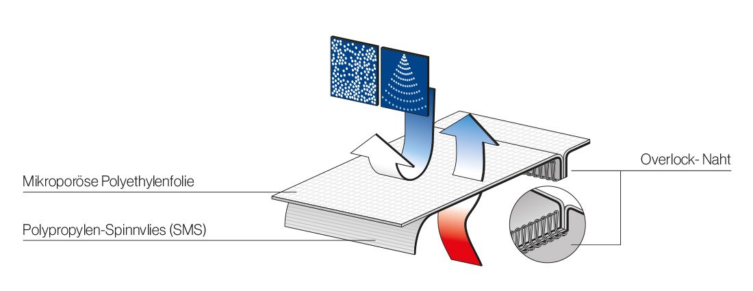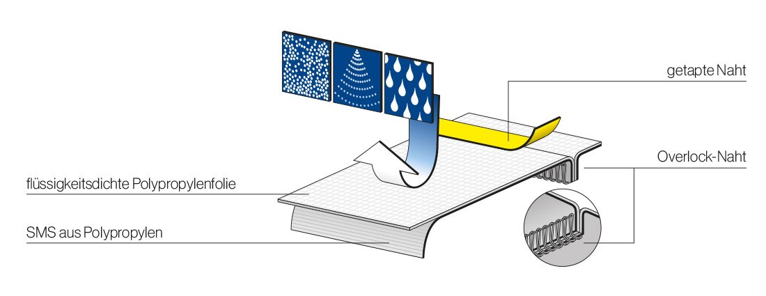 Der uvex 5/6 besteht aus einem sehr leichten, mikroporösen Spinnvlies-Polyethylen-Laminat und bietet durch die Kombination mit der SMS-Spinnvlies-Rückenpartie ein hohes Maß an Atmungsaktivität. Zusammen mit den eingefassten Nähten garantiert er hohen Schutz vor Flüssigkeitsspritzern und Partikeln.