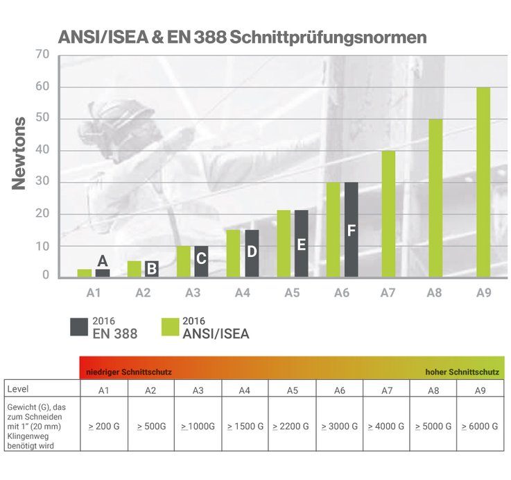 Während die A1-A9-Skala mit den EN 388 A bis F-Werten vergleichbar ist, die bis zu 30 Newton (200-3000 Gramm/2-30 Newton) messen, erweitert ANSI/ISEA ihre Skala um drei Stufen auf 6000 Gramm/60 Newton, um Materialien mit hohen Werten genauer zu unterscheiden.