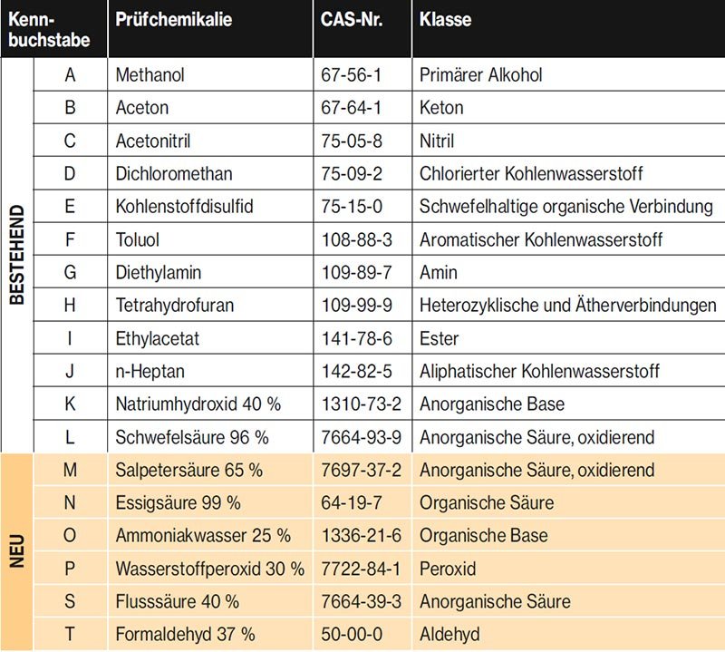Erweiterung der Prüfchemikalien: Der Prüfkatalog laut neuer Norm wurde erweitert.