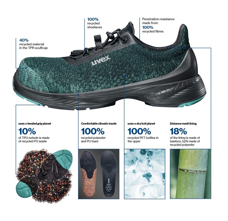 Many of the shoe's components, such as the upper and insole, are made from 100 percent recycled materials. In addition, uvex already uses some of its own PU waste for the production of the outsole: up to 10 percent has been used in the uvex x-tended grip planet.