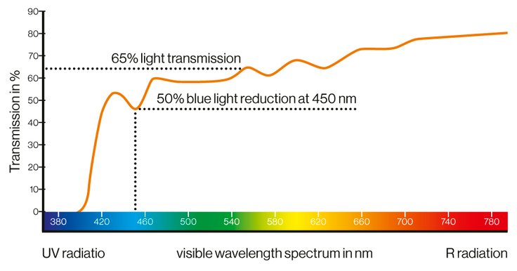 Strain on the eye caused by blue light has increased enormously as a result of intensive use of electronic devices (PCs, smartphones, tablets, LED TVs, etc.) and the switch from incandescent light bulbs to LEDs.
